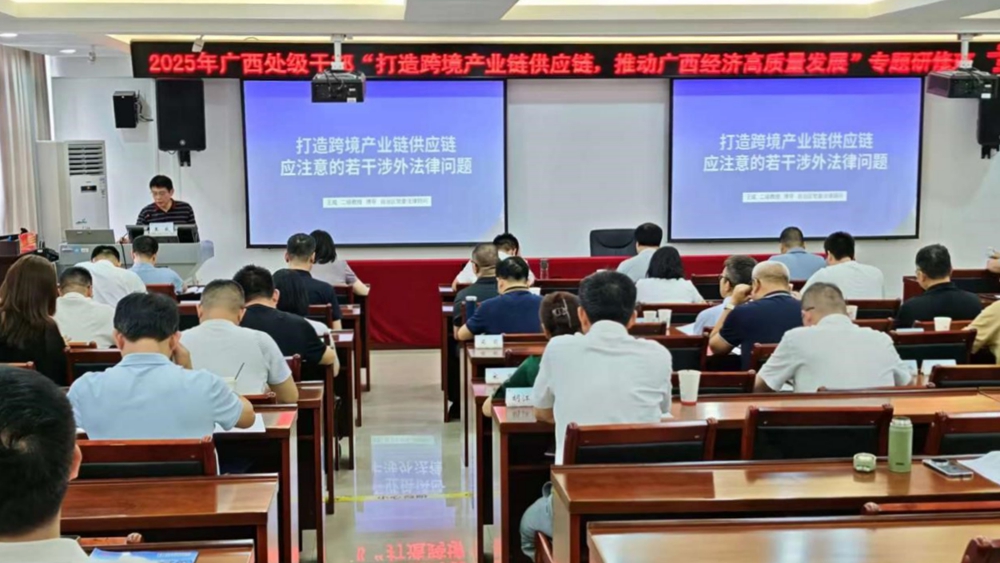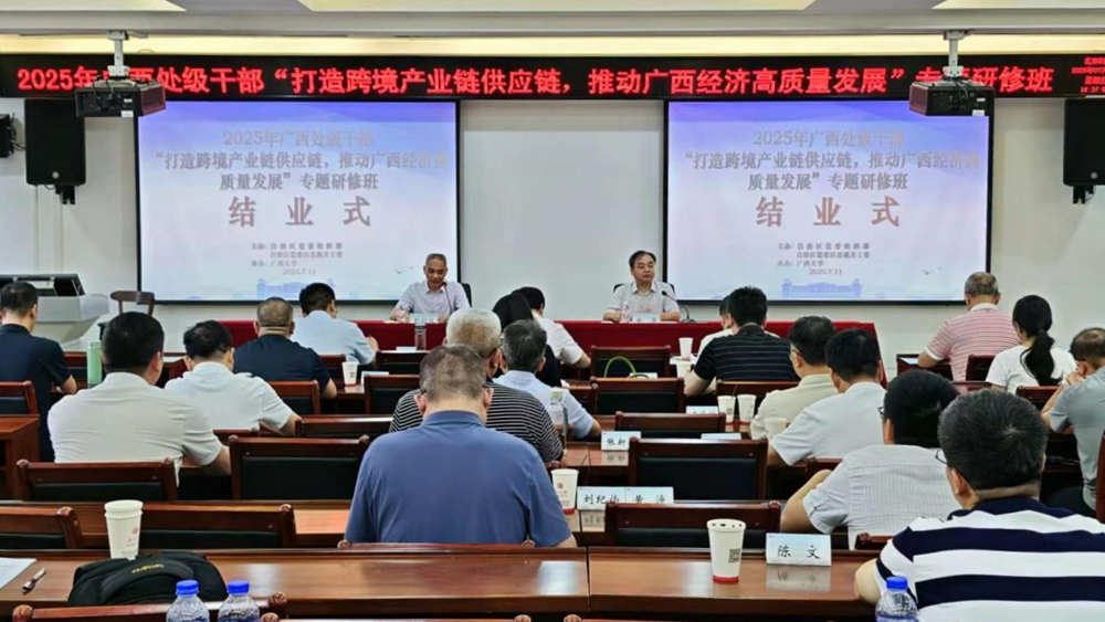 为更好地打造跨境产业链供应链,深化跨境区域合作取得新成效,推动广西经济高质量发展,2025年7月7日至7月11日,由中共广西壮族自治区委员会组织部、中共广西壮族自治区委员会直属机关工委主办,广西大学承办的广西2025年处级干部“打造跨境产业链供应链,推动广西经济高质量发展”专题研修班在我校圆满举办。